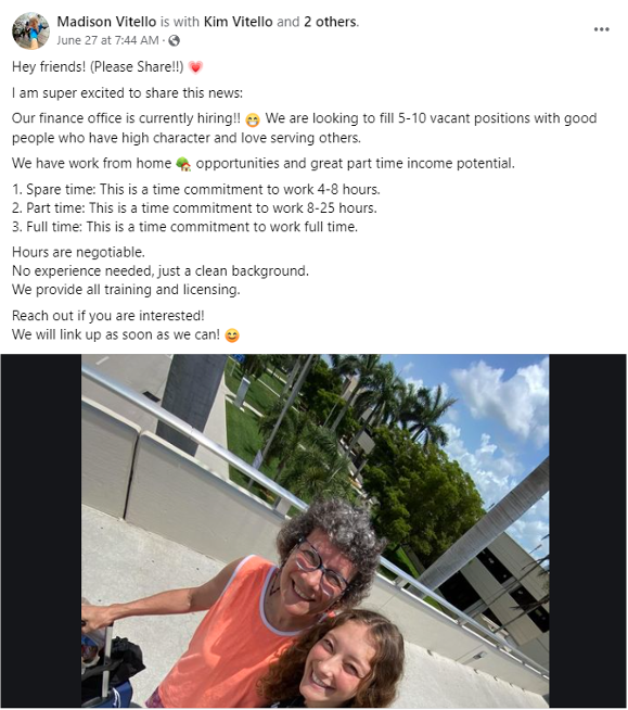Life Update:I am now recruiting for a financial company!We are looking to fill 5-10 vacant REMOTE positions.Our finance office is looking for people who have high character and a heart to serve others.We have work from home income options.1. Spare time: This is a commitment of working 4 to 8 hrs2. Part-time: This is a commitment of working 8 to 25 hrs3. Full-time: This is a commitment to work full timeHours are negotiable. No experience needed, just a clean background. We provide all the training and licensing.Adding a picture of me for good measure😊
